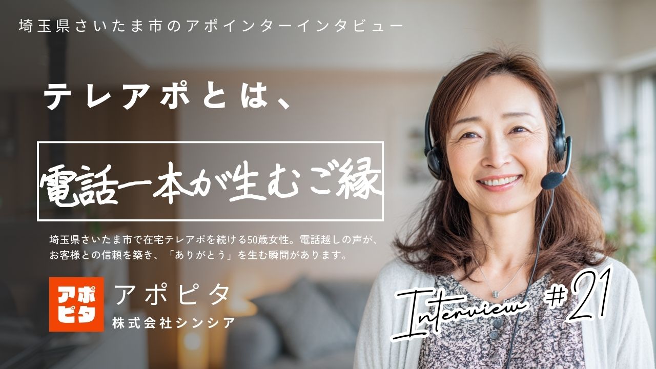 埼玉県さいたま市に暮らす一人の主婦として、地元の皆様のお役に立てるこの仕事に誇りを感じています。日々の電話を通じて、人との繋がりや信頼を築ける喜びを噛み締めながら、これからも声のチカラで「電話一本が生むご縁」を大切に、テレアポの仕事を続けていきたいと思います。